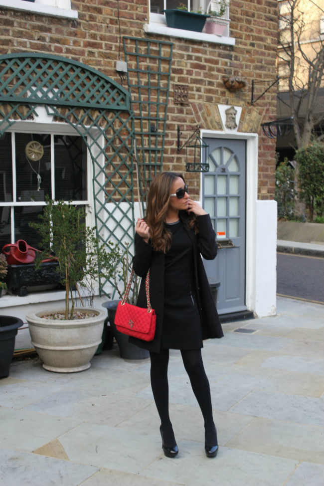 Me gusta el total black con el toque de rojo del bolso, muy elegante!