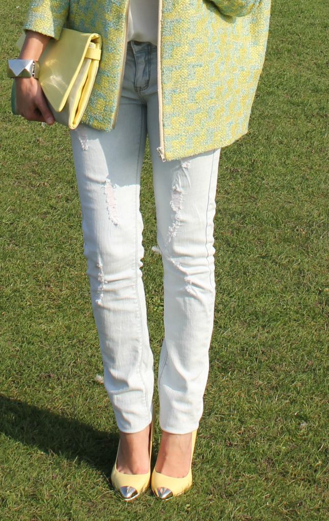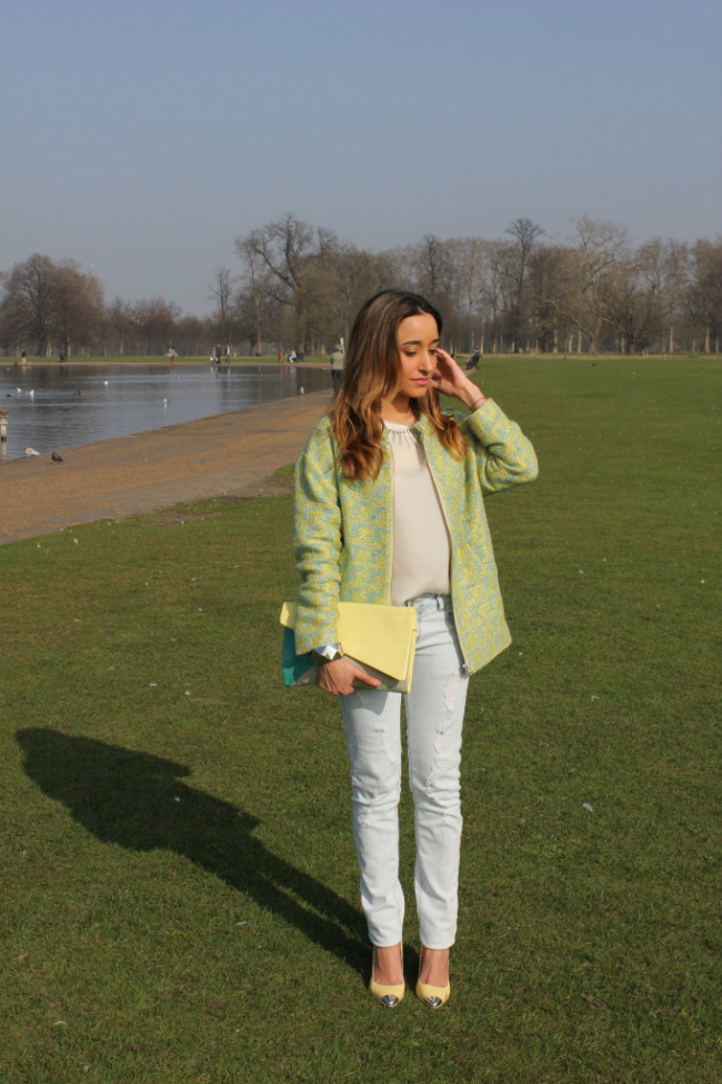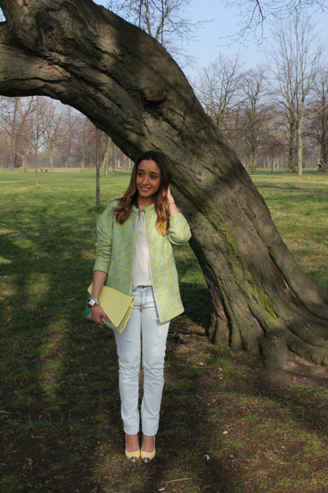 La chaqueta es preciosa, aunque no la he encontrado en tienda :-( La combinación con los complementos en amarillo queda genial.