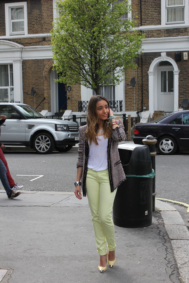 Que guapa!...me gusta mucho la combinacion de ese color en el pantalon y esa chaqueta!!