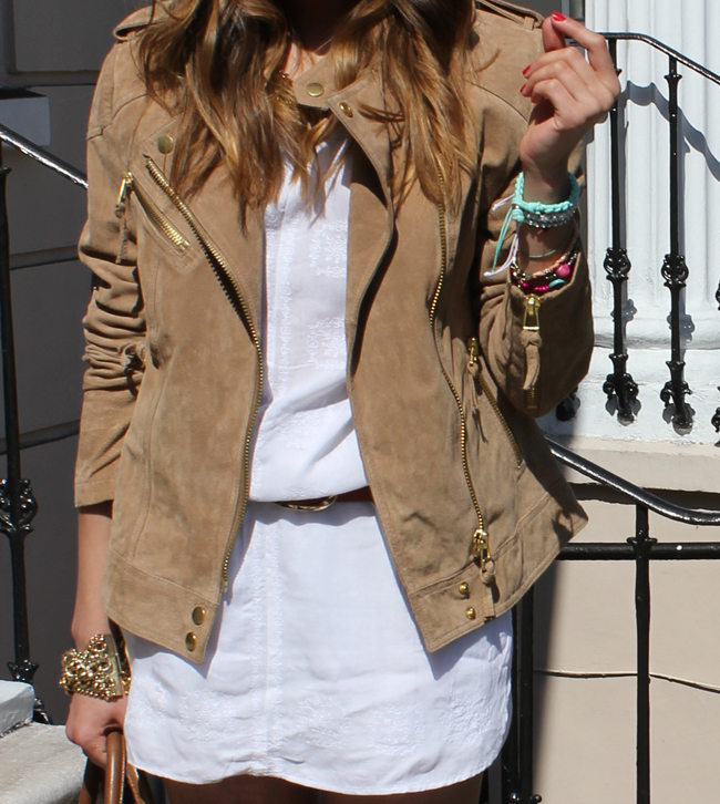 Today I show you a very simple look. I mix this white dress with a brown suede jacket. I love mixt white and brown.