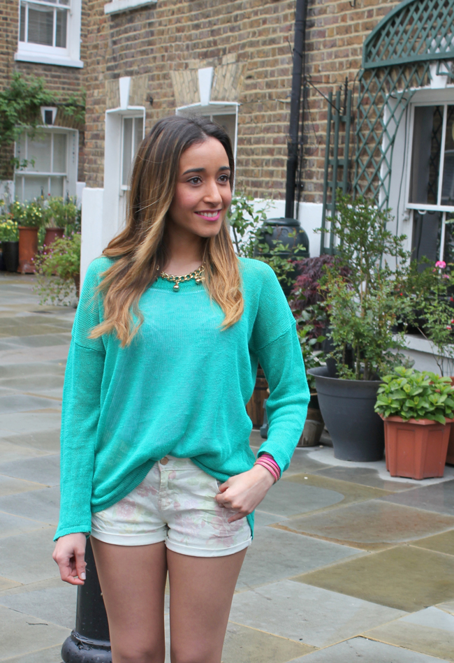 Me encantan los shorts de florecitas, estos las tienen de unos colores muy claros, por eso en algunas fotos no se pueden apreciar bien. Me animé a combinarlos con un jersey de un color más vivo, para que hiciese contraste.