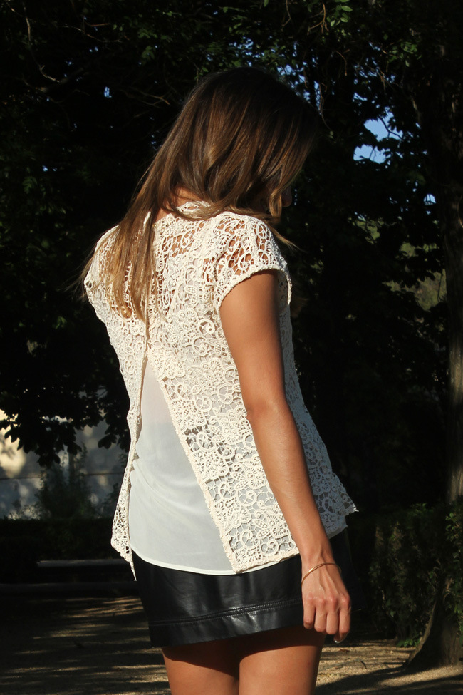 Me encanta mezclar las prendas de cuero con las de encaje. Ayer, combiné mi falda de cuero, con una blusa, que tiene una apertura en la espalda preciosa. Espero que os guste el resultado!