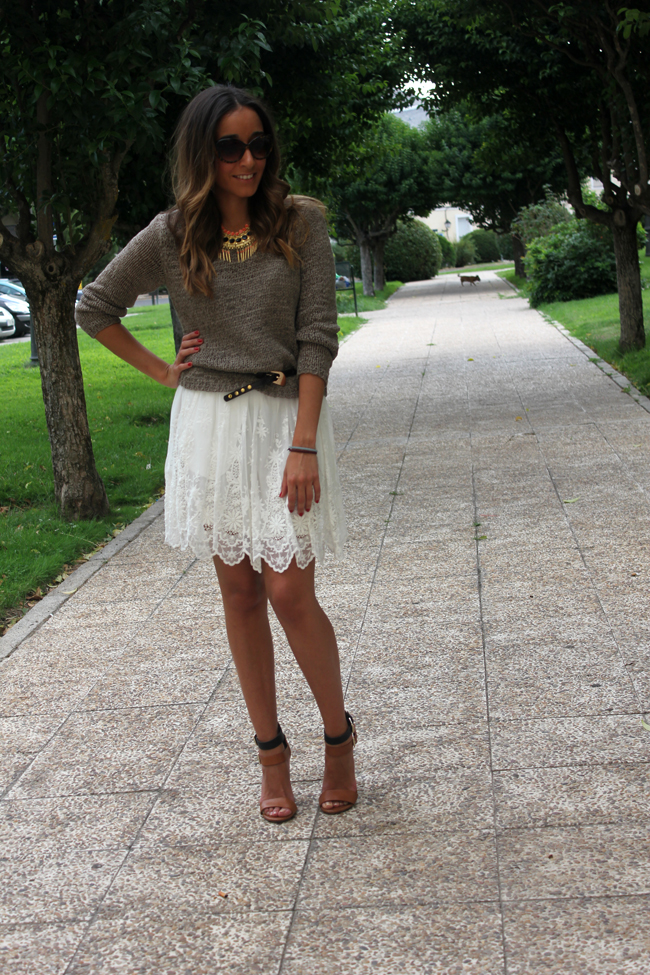Hoy os enseño un look con está falda de encaje, que me ha dado bastante juego este verano, se puede combinar de mil maneras, y en esta ocasión me la puse con un jersey marrón que es muy fino.