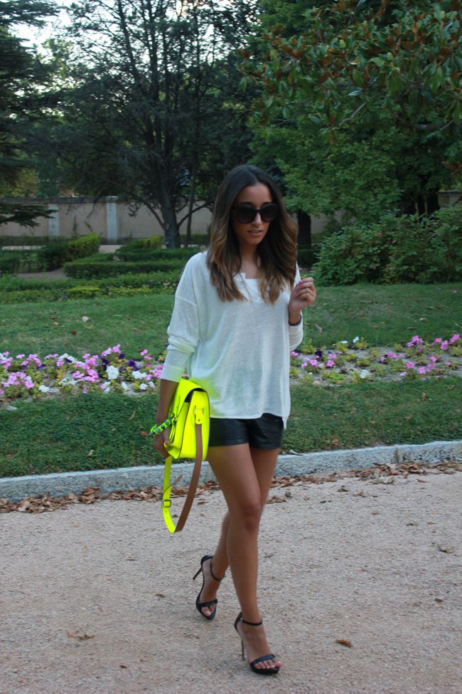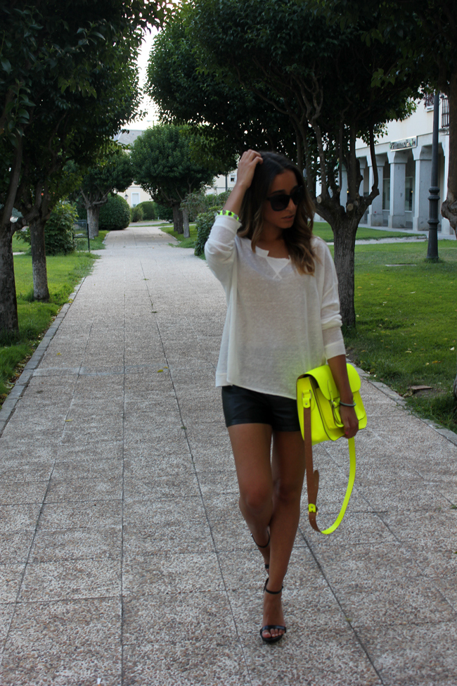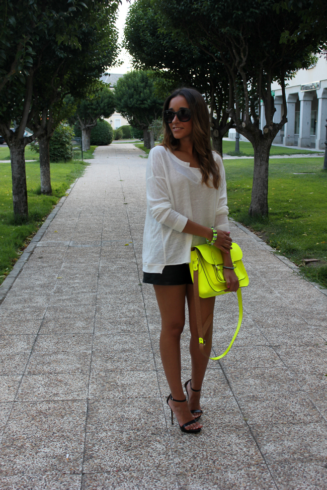A mí las combinaciones en blanco y negro también me gustan mucho, siempre me resultan muy elegantes (bueno claro, dependiendo de lo que te pongas, jajajajaja), el toque flúor del Satchel es perfecto, quizás de todos los tonos flúor en los que está, es el que más me gusta. Como siempre, un outfit perfecto. Besitos!!