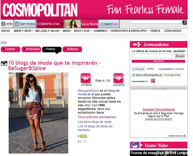 Estoy contentísima, porqué ayer aparecí en una selección de blogs de Cosmopolitan. Lo podéis ver aquí.