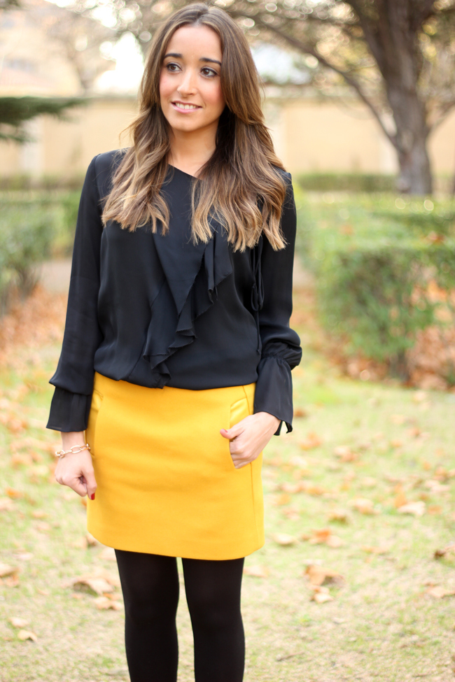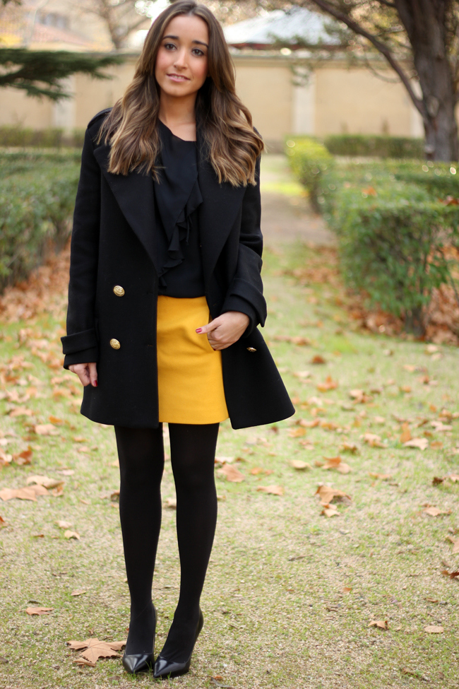 Que bien queda el mostaza con el negro, monísima la falda, y todo el look,me encanta el contraste.