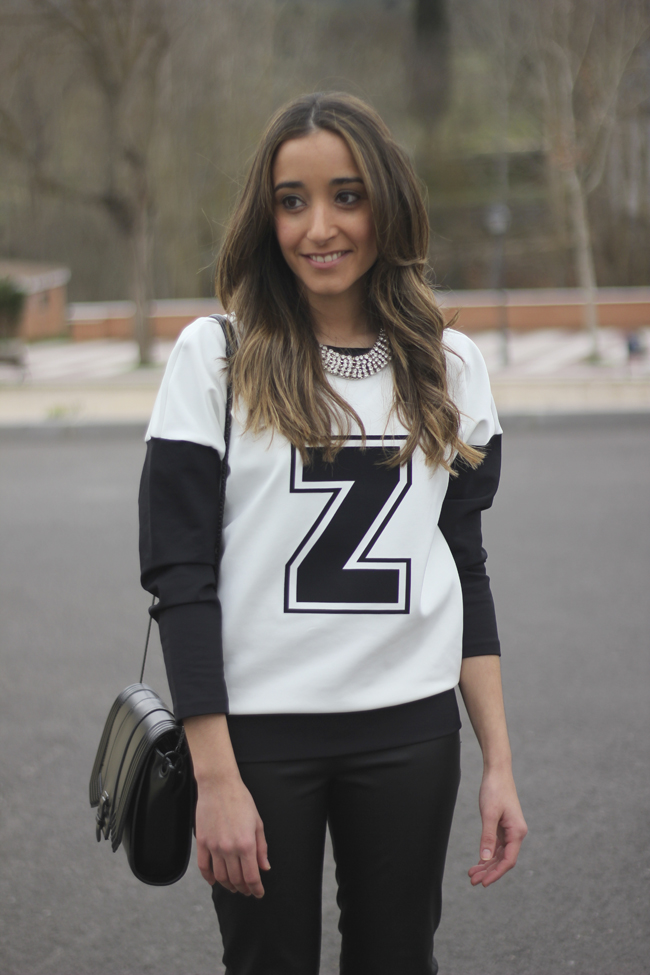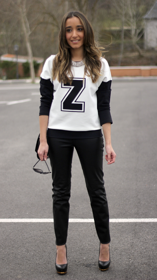 Hoy os enseño un look un poco diferente a los que os suelo mostrar. Combiné una sudadera black & white, con unos pantalones de polipiel, y para darle un toque femenino me puse unos taconazos. Ya me diréis que os parece.