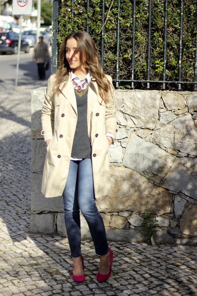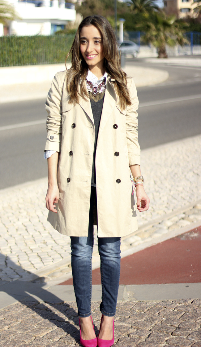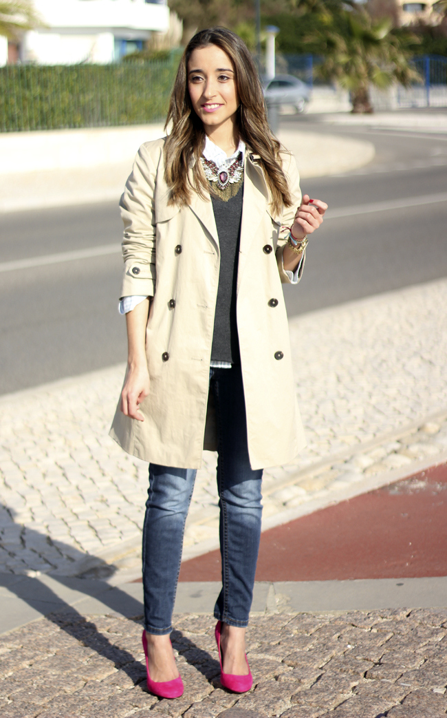 Nos gusta mucho el trench y el toque de color que le has dado al look con los zapatos fucsia:)
