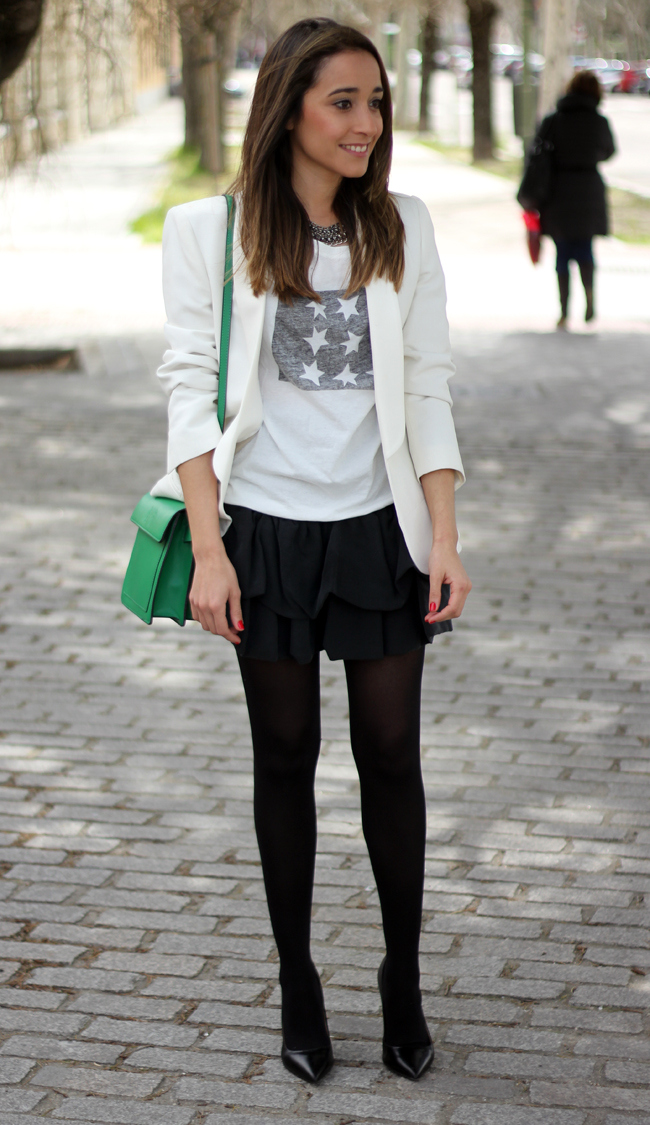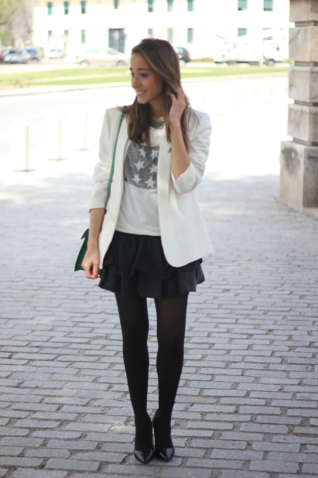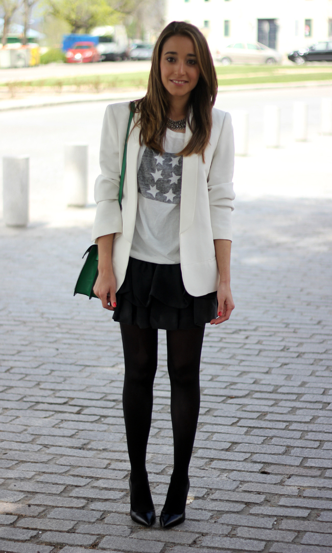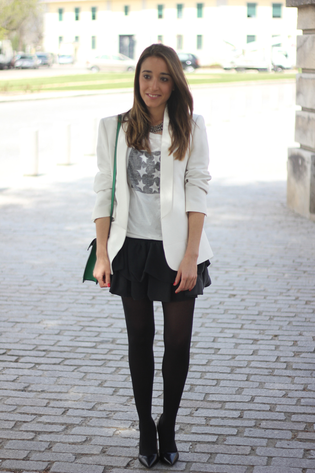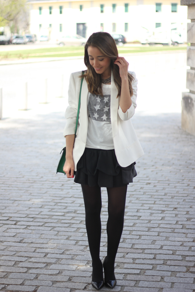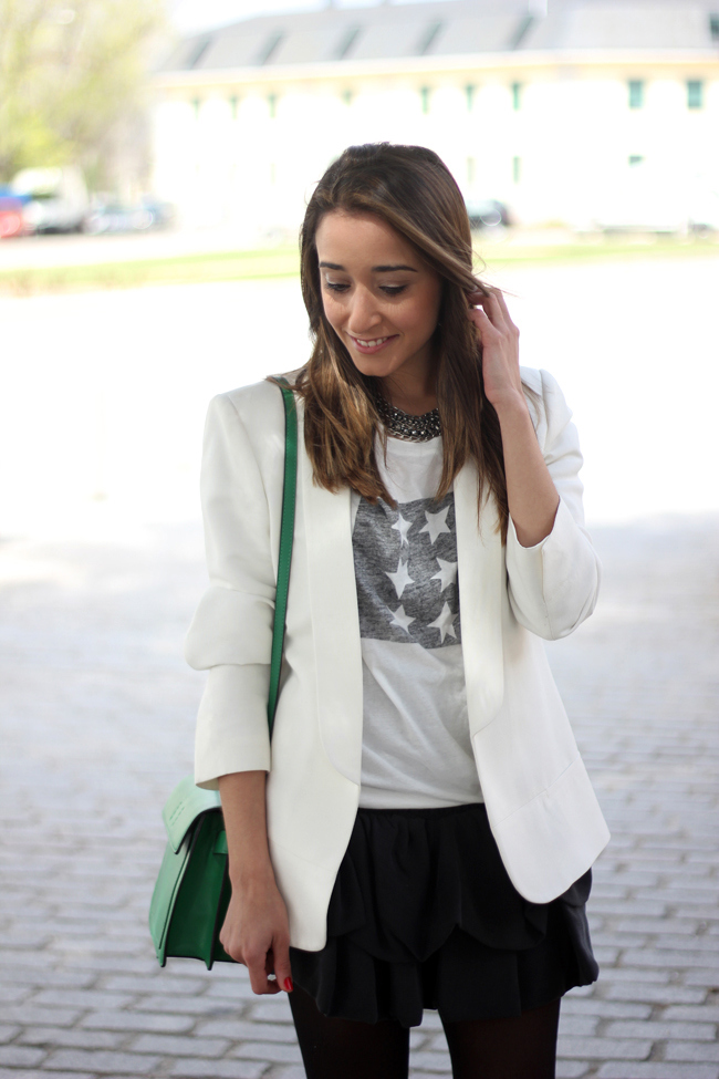 After a few days wearing pants, yesterday I really wanted to wear a skirt. And I chose this cute skirt from Maje, which this time I combined it with a shirt to give it a casual touch, and a white blazer. I love the green bag, it´s very comfortable to wear and I can carry many things inside it, so it seemed perfect to give it a touch of color to the outfit.