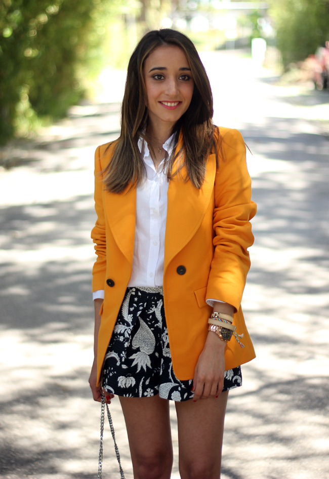 Hoy un look con sabor a verano. Es una pena que en las fotos no se aprecie del todo lo monos que nos los shorts, porqué tienen un corte en la parte delantera que queda genial,y el print me parece precioso. Los combine con una blazer en color mostaza y complementos en blanco. En el post anterior ya os dije, que tenía muchas ganas de ponerme los salones blancos, y ayer por fín los estrené.