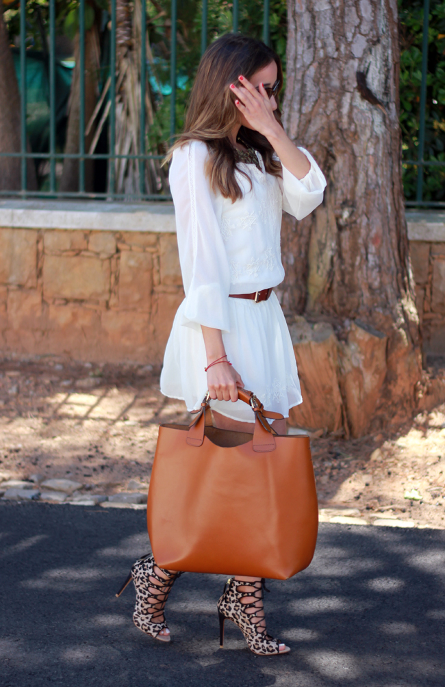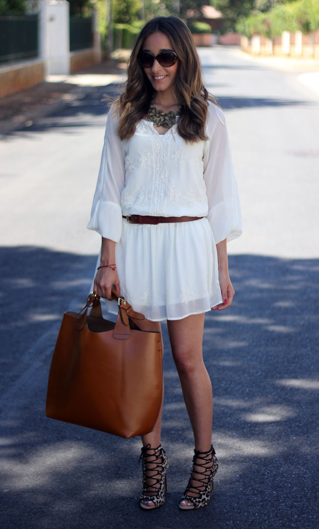 It was long since I wore a dress, because lately I have been wearing pants a lot. Yesterday I wore this beautiful white dress with a leopard print shoes, and accessories in brown.