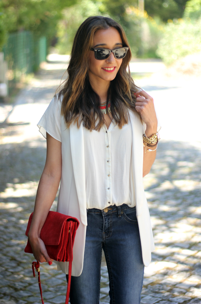 Al ver ayer este chaleco blanco en el armario, recordé lo poco que me lo he puesto, y decidí darle una oportunidad. Lo combiné con una blusa blanca y unos vaqueros, y lo accesorizé con un bolso rojo y unos zapatos print animal.