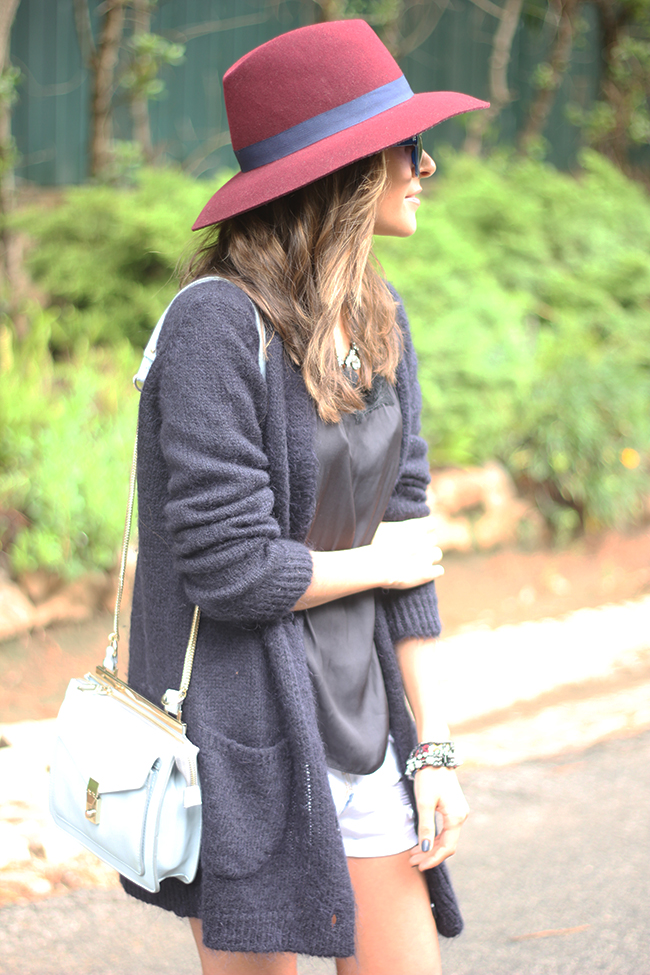 Me encanta como quedan las camisetas lenceras con cárdigans, y en esta ocasión las combiné son unos shorts vaqueros y un sombrero burdeos.