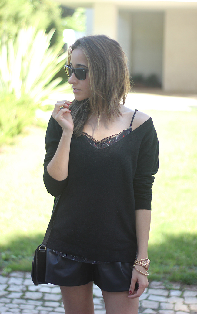 Casi siempre lo más sencillo suele ser la mejor opción. Hoy os enseño un look muy sencillo y muy cómodo. Me encanta las prendas lenceras, y en esta ocasión combiné un top lencero con un jersey negro y unos shorts de cuero del mismo color.