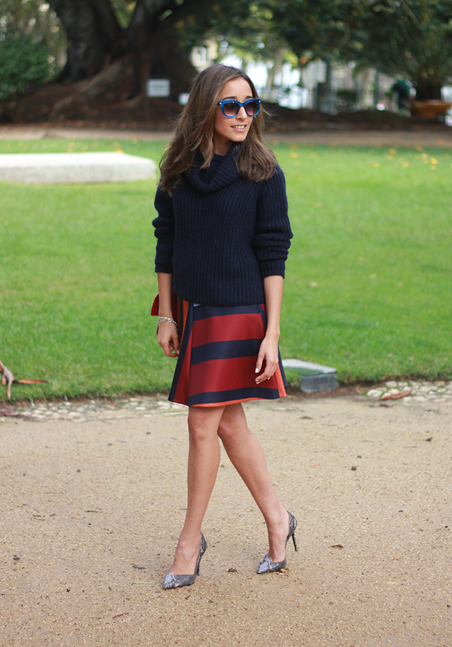 Me encantan la sensación de ponerme un jersey gordito y agradable al tacto. Ayer combiné uno de color azul marino con una falda con rayas de colores.