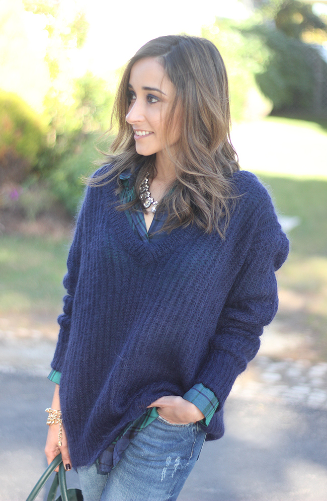 Today I show you a super comfortable look with a blue wide sweater, a plaid shirt in blue and green and a pair of jeans.