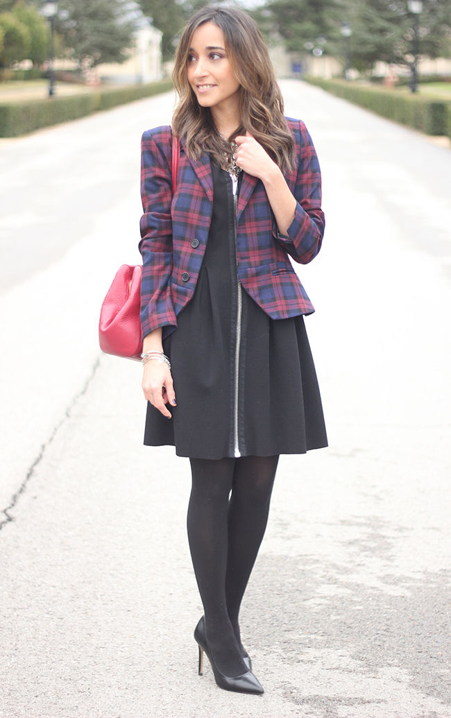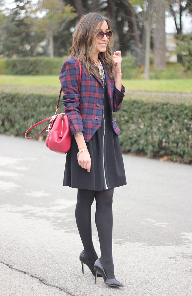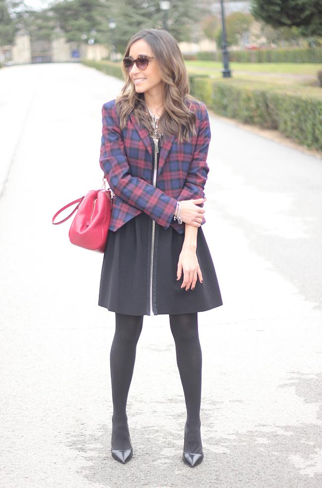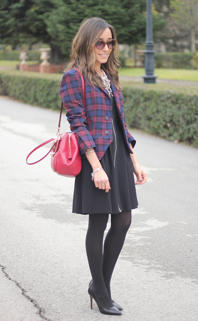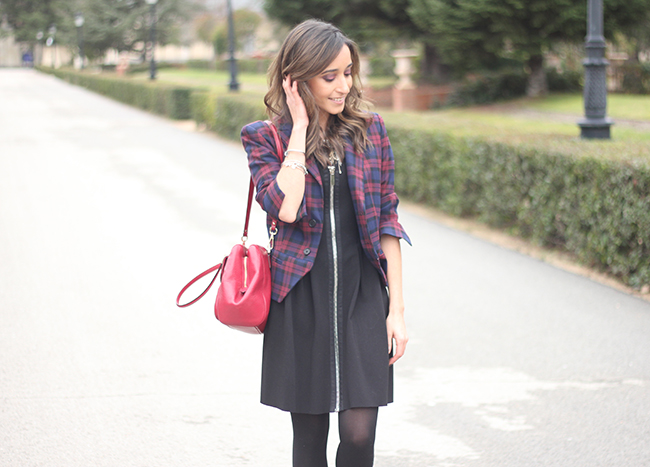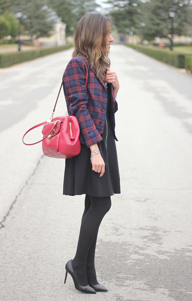 Espero que los reyes se hayan portado bien con vosotros. Hoy os enseño un vestido negro, que tiene la originalidad de tener la cremallera en la parte delantera. Lo combiné con una chaqueta con estampado tartán, y bolso color frambuesa.