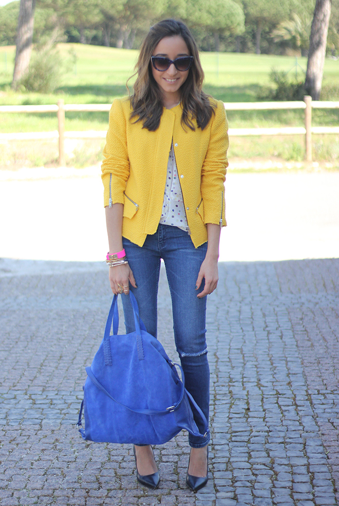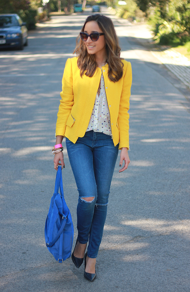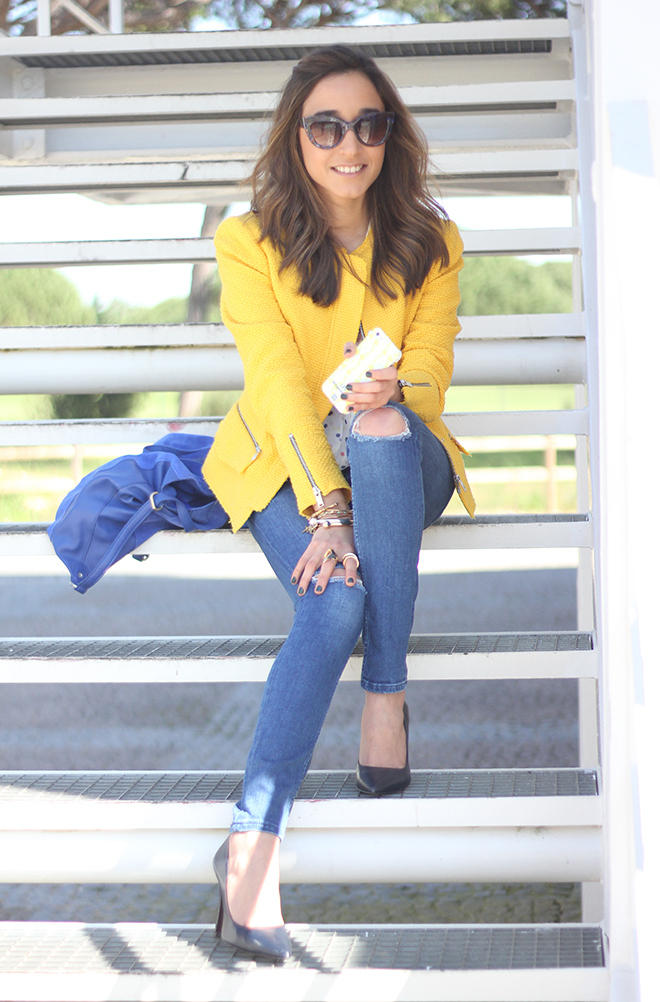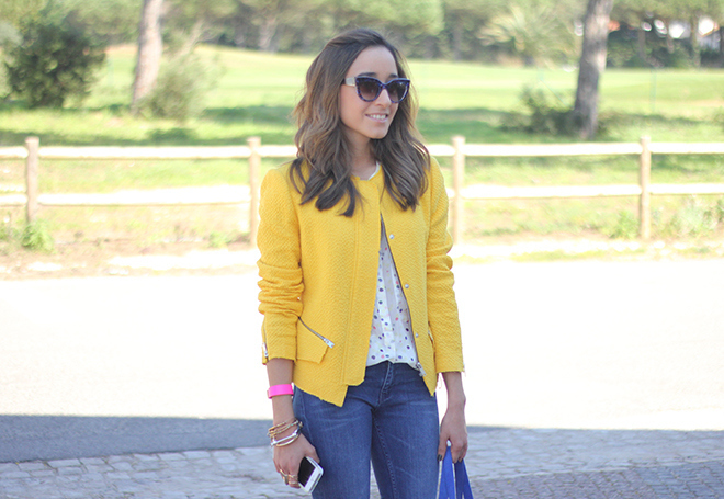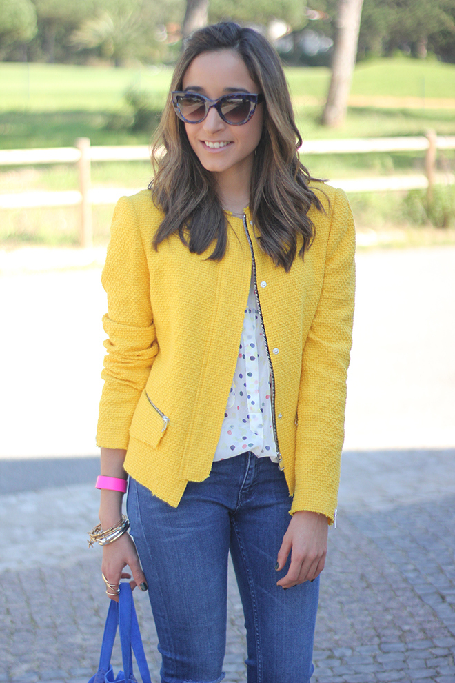 In this look I changed pastels colors for bright colors. The other day I was looking for a brightly colored jacket, and I found this awesome yellow jacket which has a lovely cut and fits perfect. I combined it with a blouse with polka dots which I bought a long time ago and I´ve never worn it before.