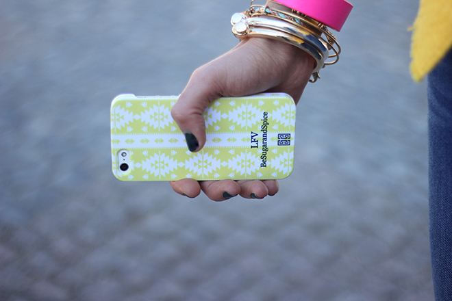 La chaqueta es preciosa, la funda con el nombre del blog es genial y me encanta el toque de la pulsera rosa flúor con el conjunto general!