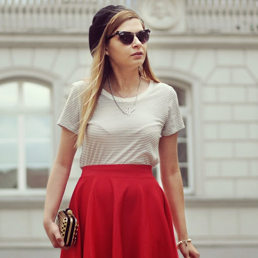 Me chifla el look, la combinación de rayas y lunares, el toque de rojo, el volumen de la falda..... Todo!