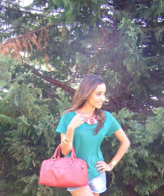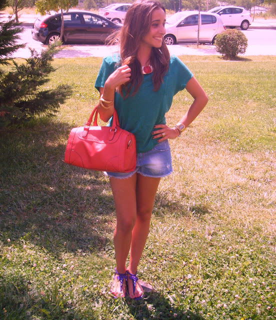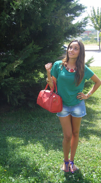 At the beginning of the season did not trust the color block trend were to like me, but finally I loved. This time I mix a green shirt with blue jeans shorts.I love these sandals of Zara, I think that are really cute. These are the sandals that I wear more.