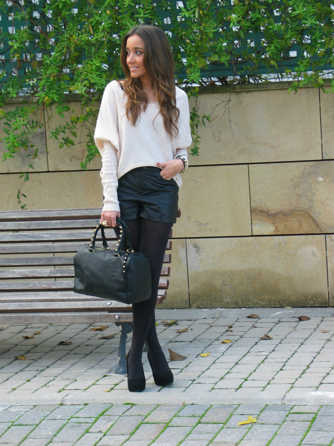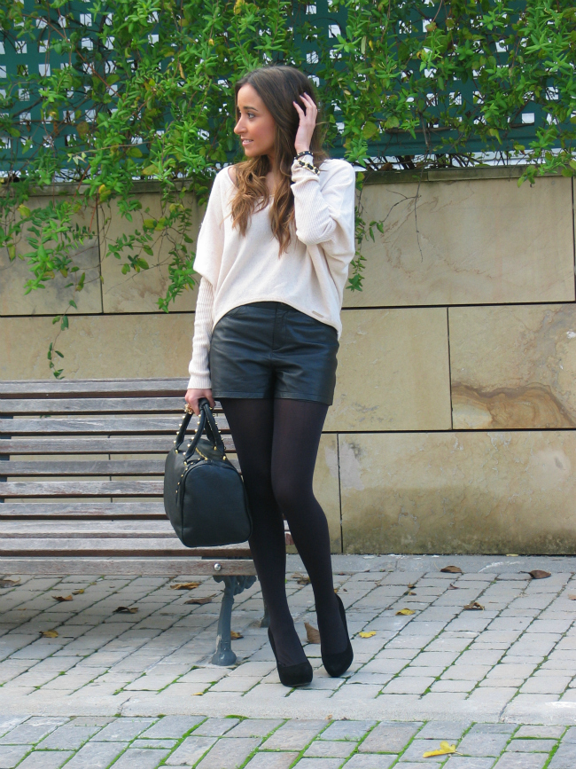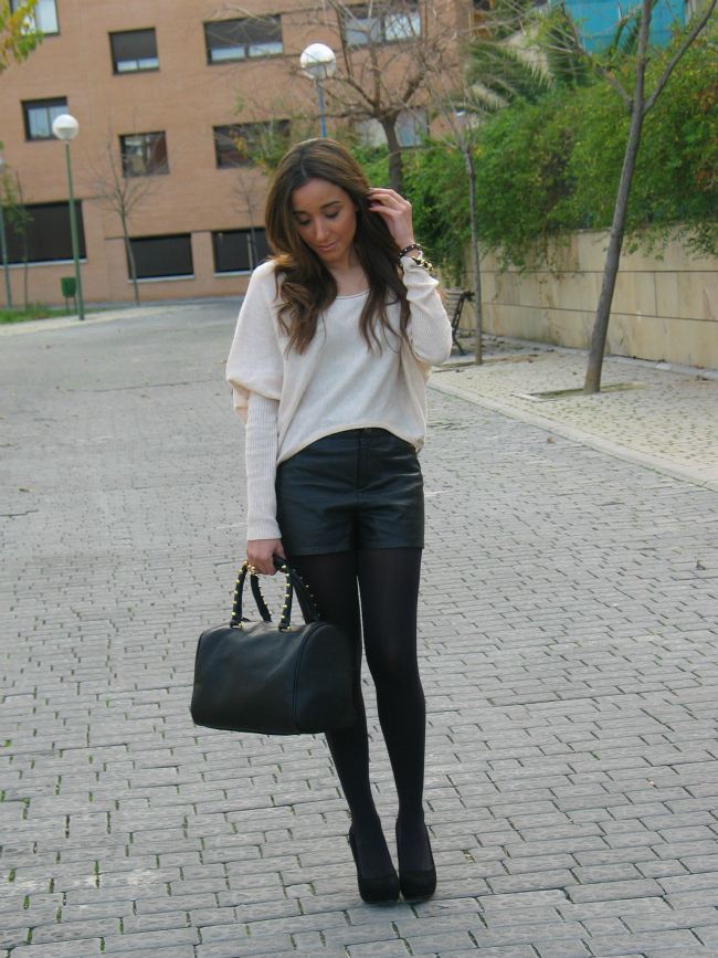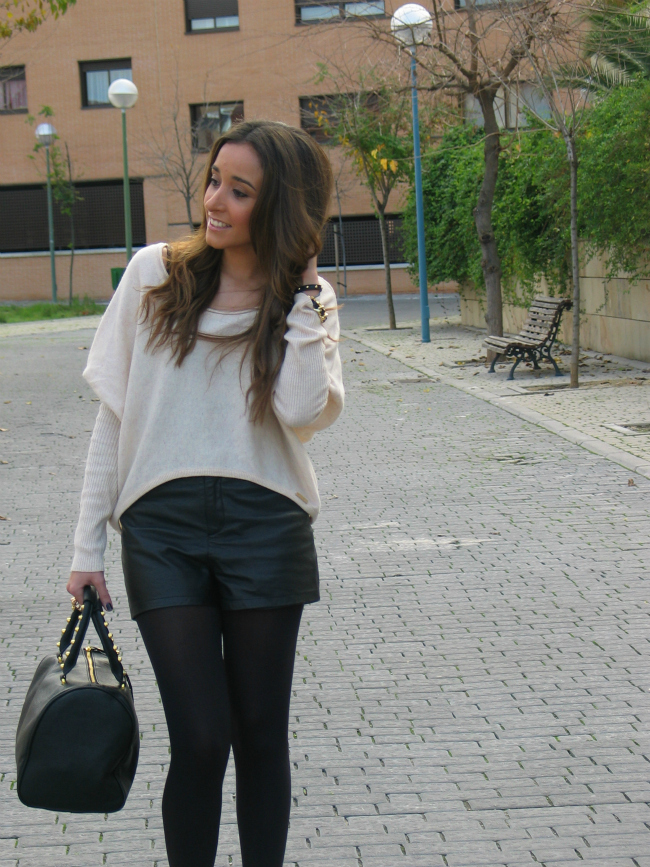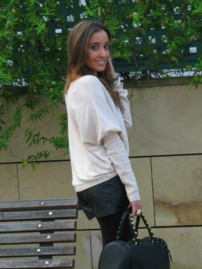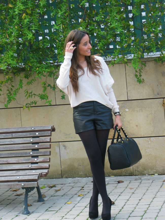 Hoy os he dejado un look con unos shorts de cuero, que me estoy poniendo muchísimo. El jersey me encanta por el corte tan favorecedor y original que tiene, me lo compre en una tienda que descubrí hace poco, y me enamoró.