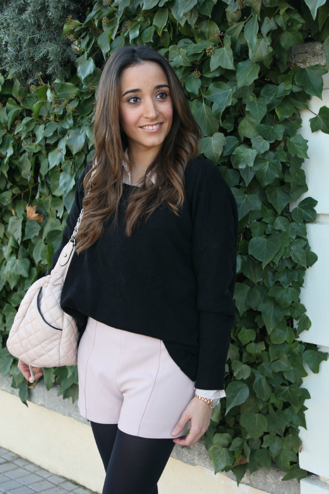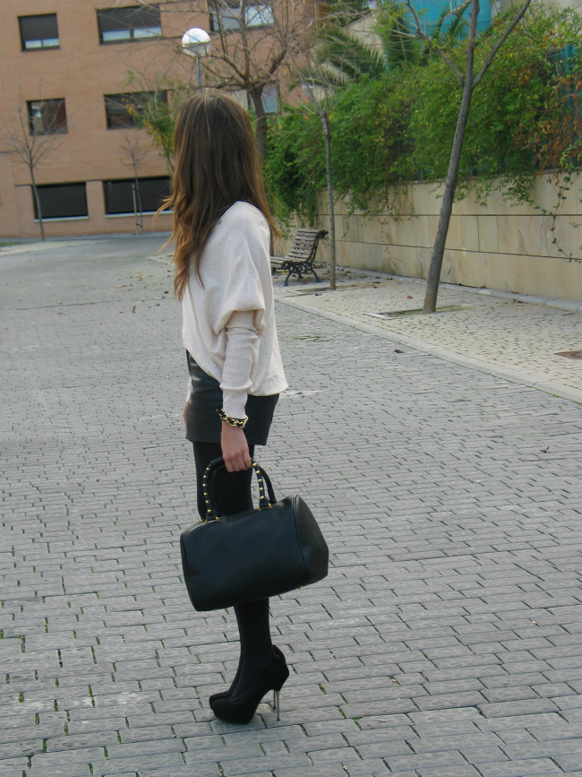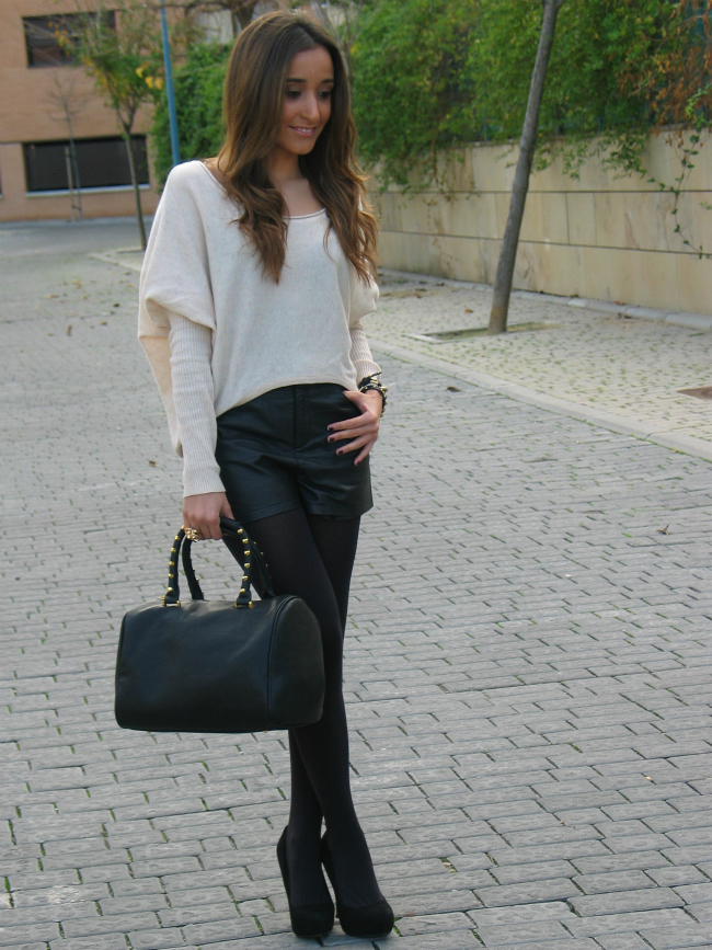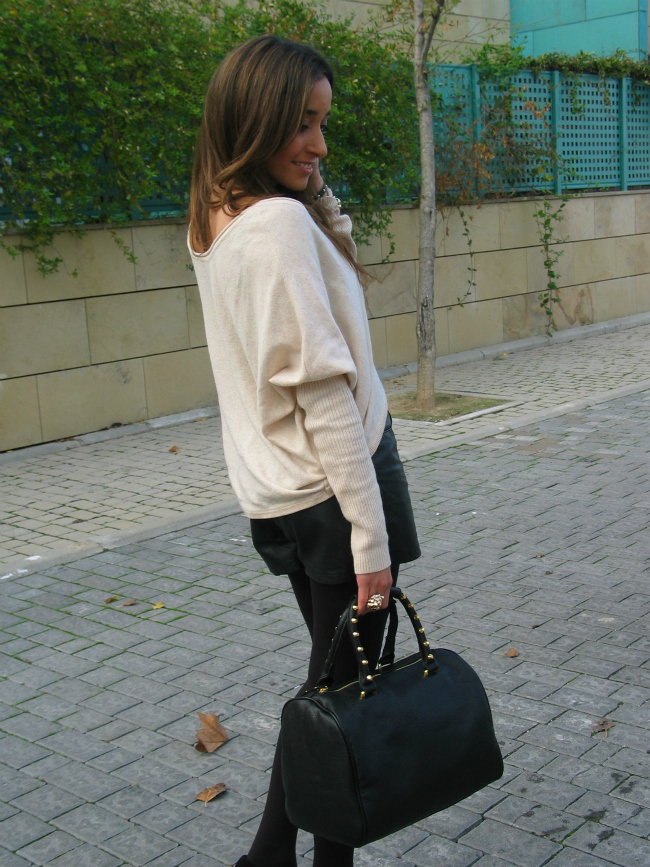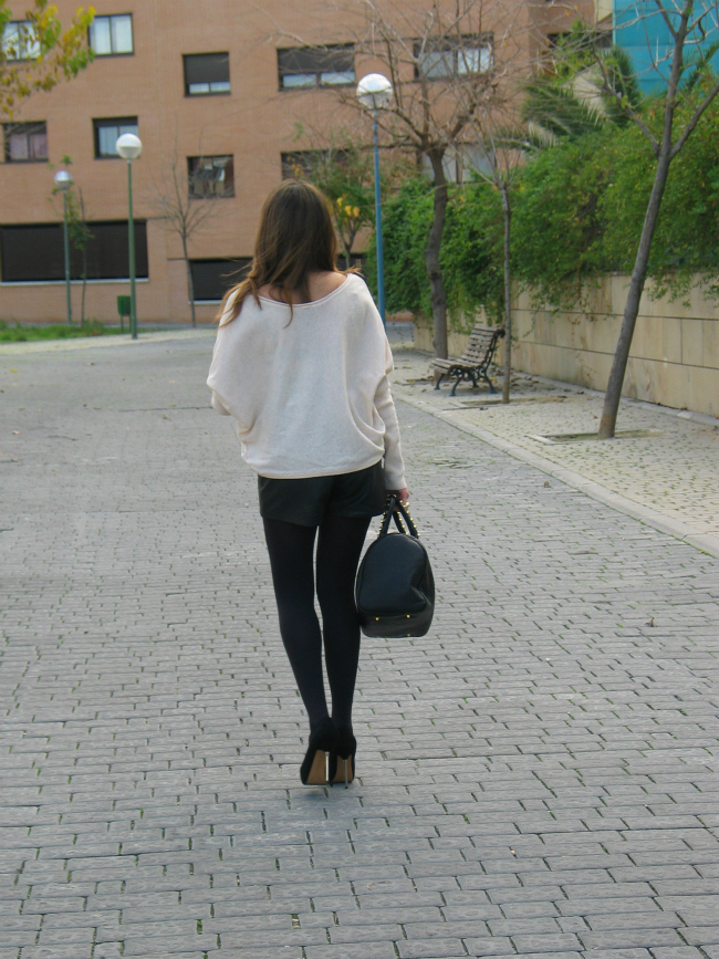 Hoy os he dejado un look con unos shorts de cuero, que me estoy poniendo muchísimo. El jersey me encanta por el corte tan favorecedor y original que tiene, me lo compre en una tienda que descubrí hace poco, y me enamoró.