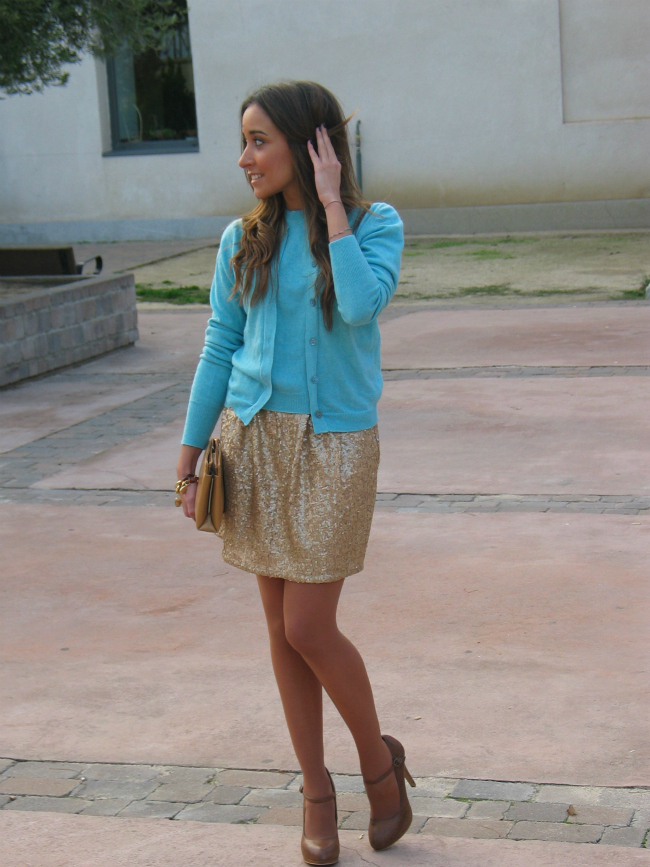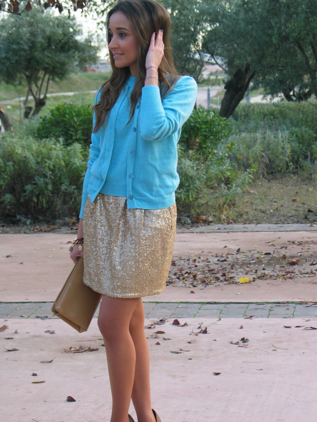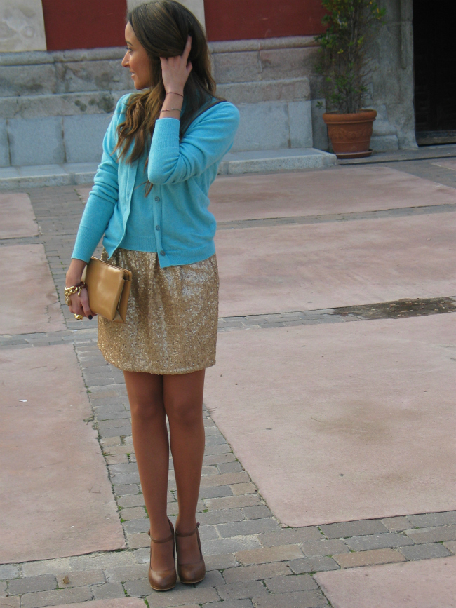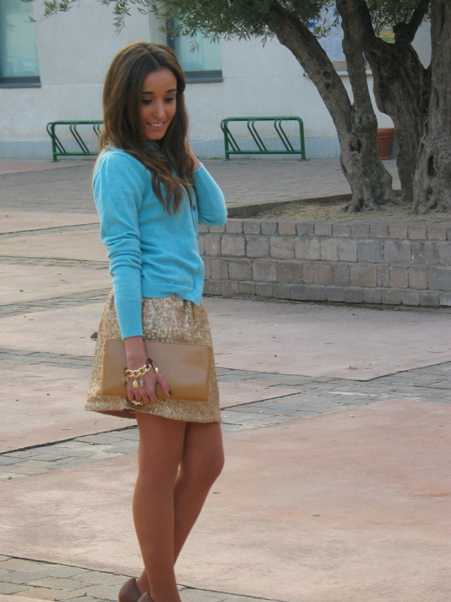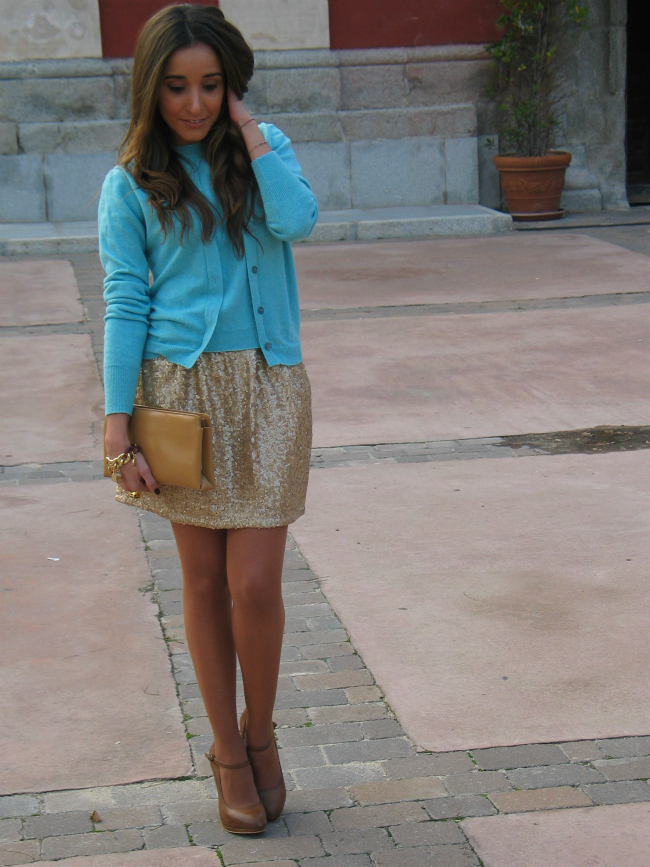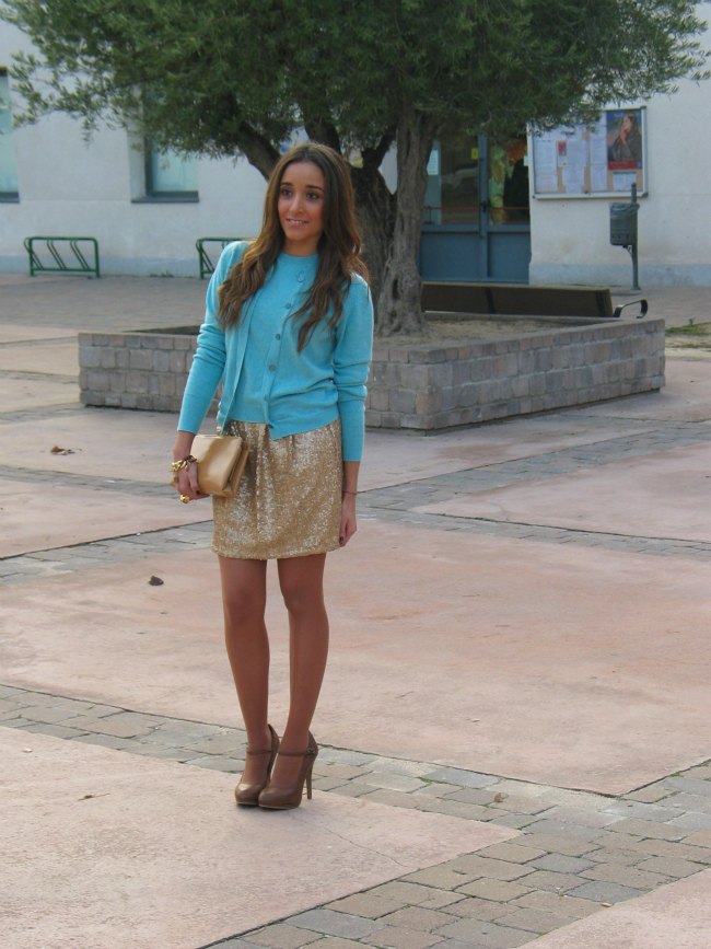Lo que más me gusta de este look, es la mezcla de tejidos, el punto con lo paillettes, y la mezcla de colores.
